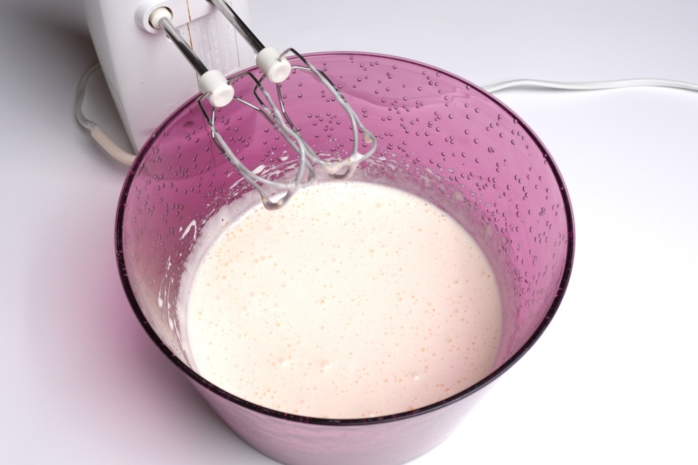 Добавить в яйца сметану (15%) и растительное масло. Перемешать миксером до однородности.