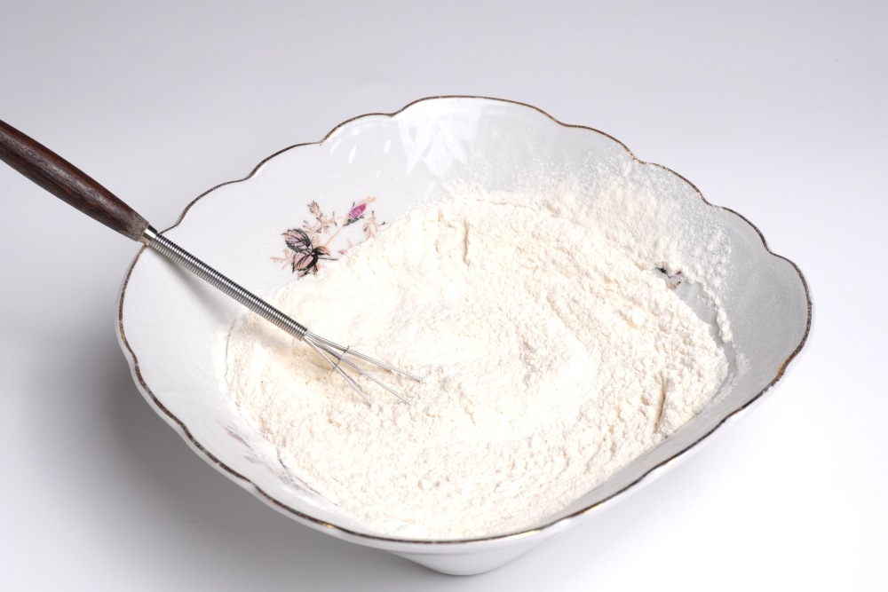 В отдельную миску просеять муку и разрыхлитель, перемешать.