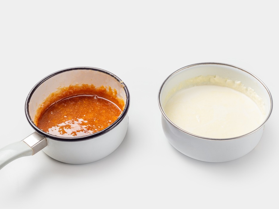 Чтобы приготовить карамель в сухую кастрюльку с толстым дном положить сахар, поставить на слабый огонь. Растопить, периодически помешивая силиконовой лопаткой. Одновременно в другой кастрюльке довести до кипения сливки, но долго их не кипятить.