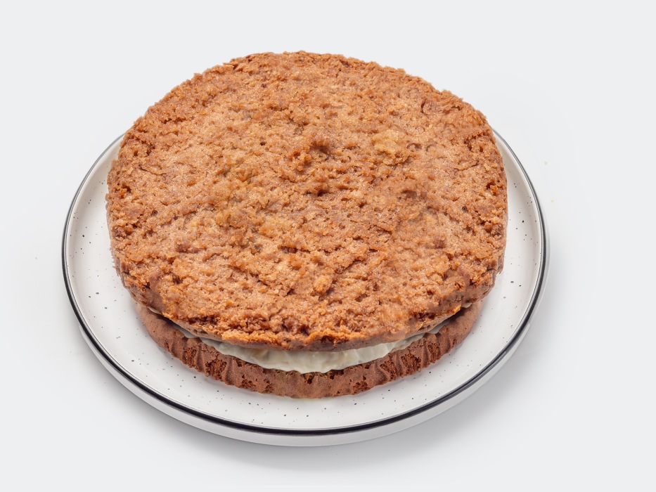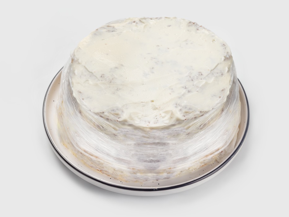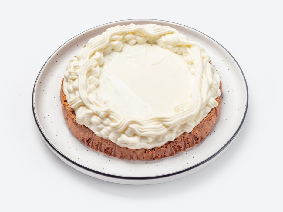 Обильно смазать второй корж кремом. Торт зафиксировать кулинарным кольцом или пищевой пленкой.