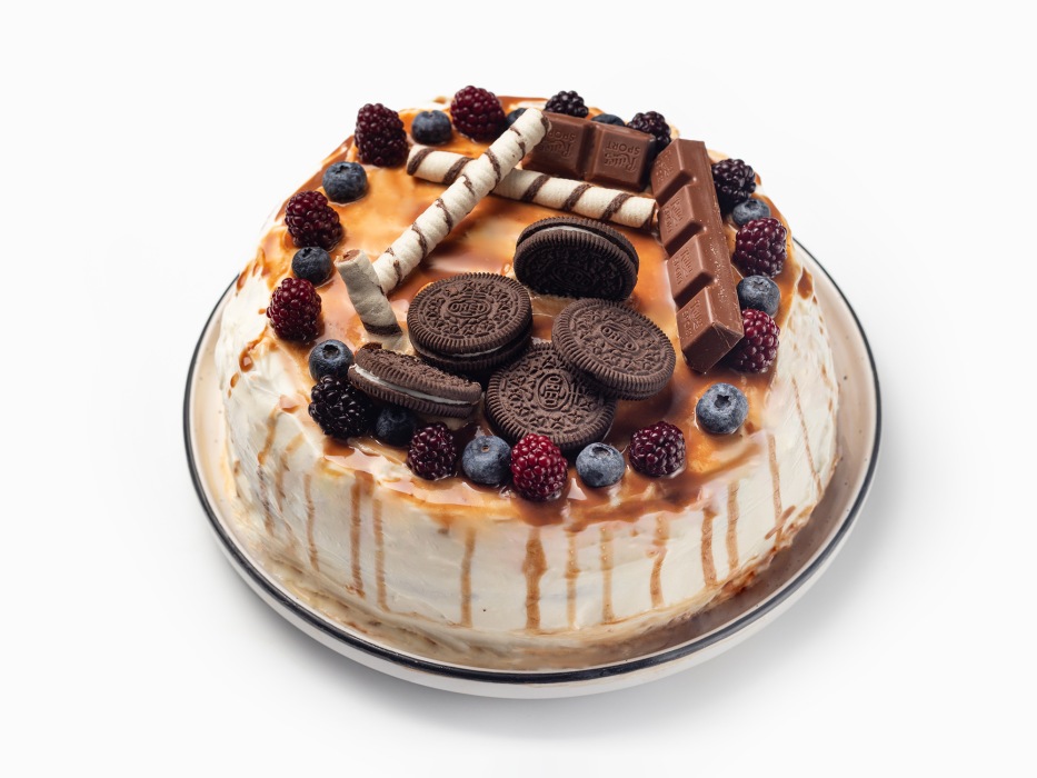 Полить глазурью сверху торт и украсить ягодами, шоколадом и печеньем.