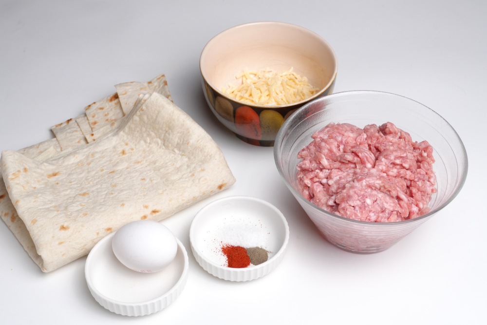 Подготовить все ингредиенты для приготовления треугольников из лаваша с фаршем для заготовки в морозилку. Лаваш нужен тонкий армянский, в листах. Фарш лучше взять из смеси свинины и говядины. Набор специй у меня стандартный: соль, черный молотый перец и паприка. По желанию, можно добавить сухие травы, чеснок, кориандр. Сыр для обсыпки беру тертый твердый. Можно также взять моцареллу.