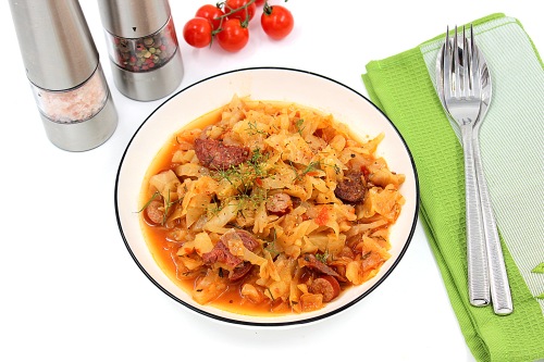 К колбасе только одно пожелание — она должна быть именно горячего копчения. Если мы говорим про бигос, то это уже и разные виды колбасы и мяса. А здесь всё максимально просто и доступно — тушёная капуста с колбасой.