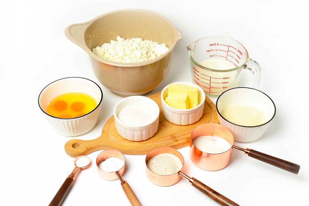 Подготовить ингредиенты для запеканки: творог, яйца, манную крупу, молоко, сахар и ванильный сахар, соль, сметану, разрыхлитель и сливочное масло.
