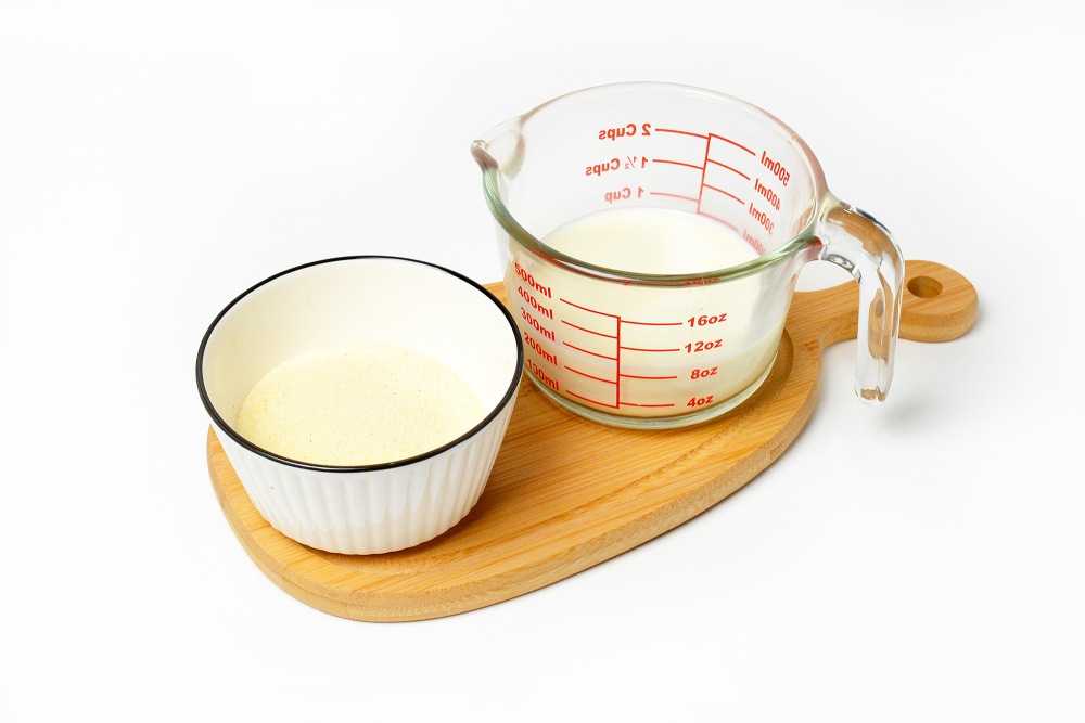 - Молоко можно использовать сухое. Разведите 25 г в 180-190 мл горячей воды (55-65 градусов) и тщательно размешайте комочки.