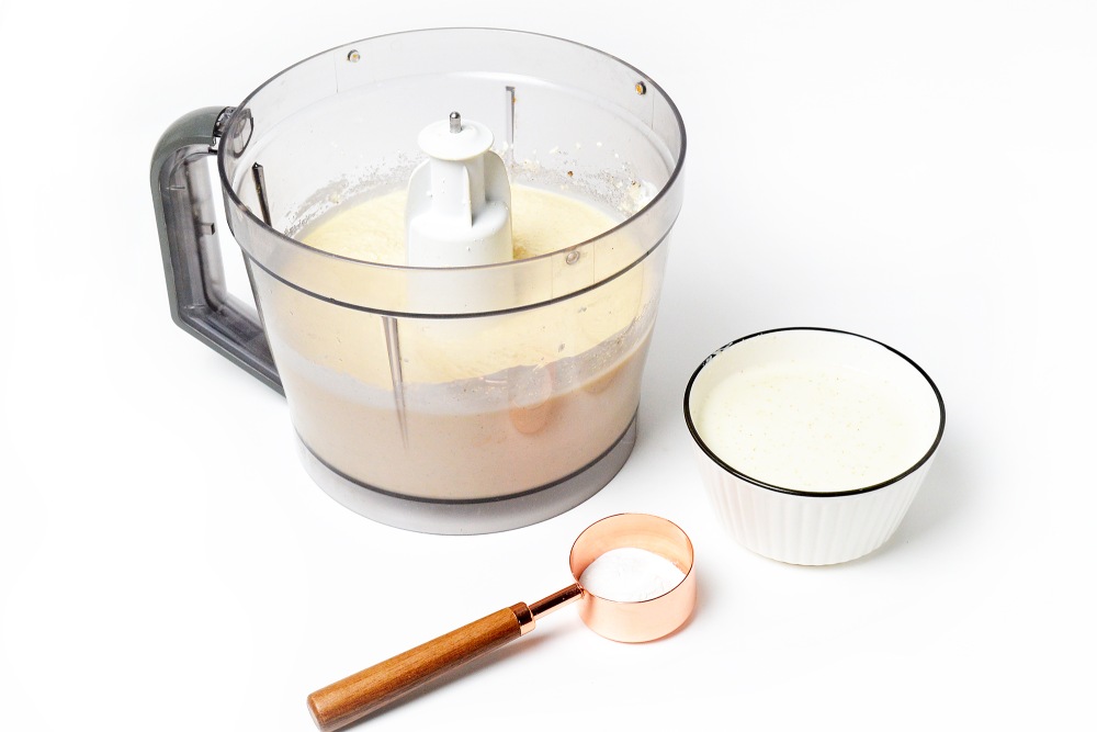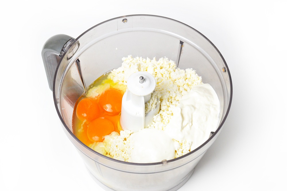 В чаше блендера смешать творог, яйца и сметану, взбить до однородности 40-50 секунд. Для 800 г творога чаша должна быть не менее 2,5 л объемом. Если блендер небольшой, делайте замес в 2 захода, а затем тщательно перемешайте ингредиенты еще раз в глубокой миске.