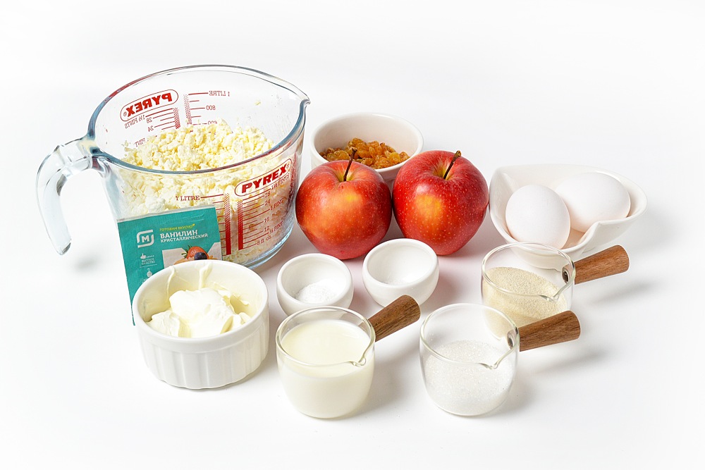 Подготовить ингредиенты: творог, яблоки, яйца, сметану, манку, молоко, изюм, сахар, разрыхлитель, ванилин и соль.