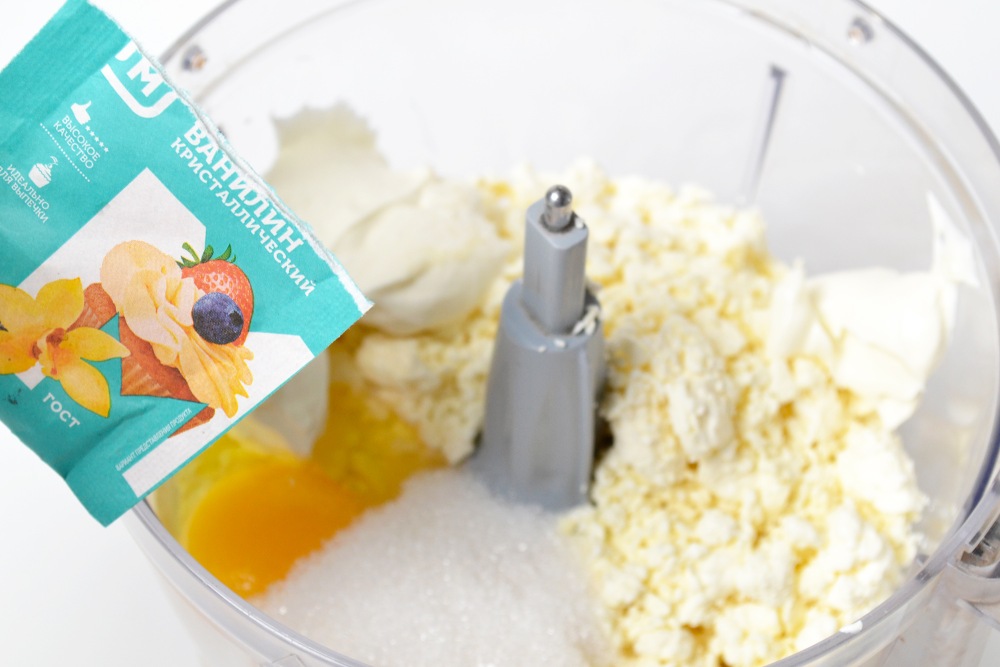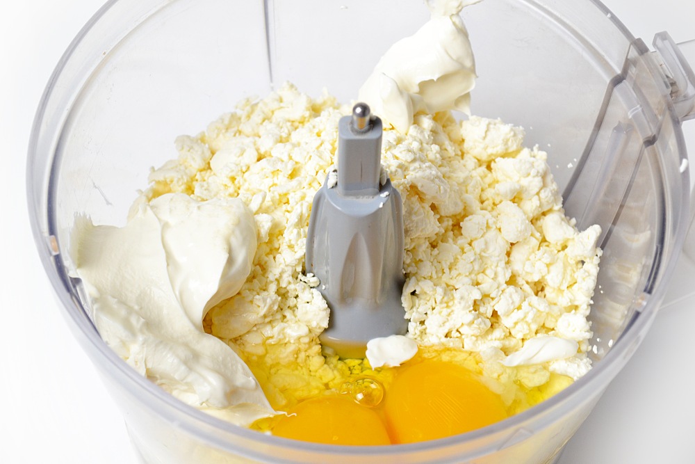 Пока настаивается манка, отправить в чашу блендера творог, сметану и яйца.