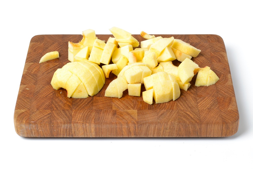 Включить духовку на 190-200 градусов. Яблоки очистить от кожуры и нарезать кубиком.