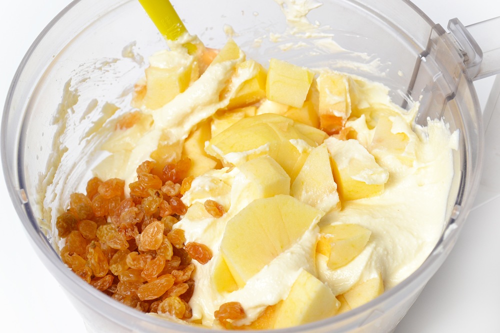 Убрать нож из блендера, добавить яблоки и изюм, перемешать лопаткой.
