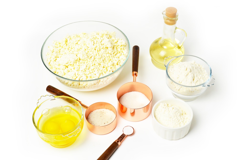 Подготовить ингредиенты: творог, яйца, муку, сахар, ванильный сахар и соль, а также мало для жарки.