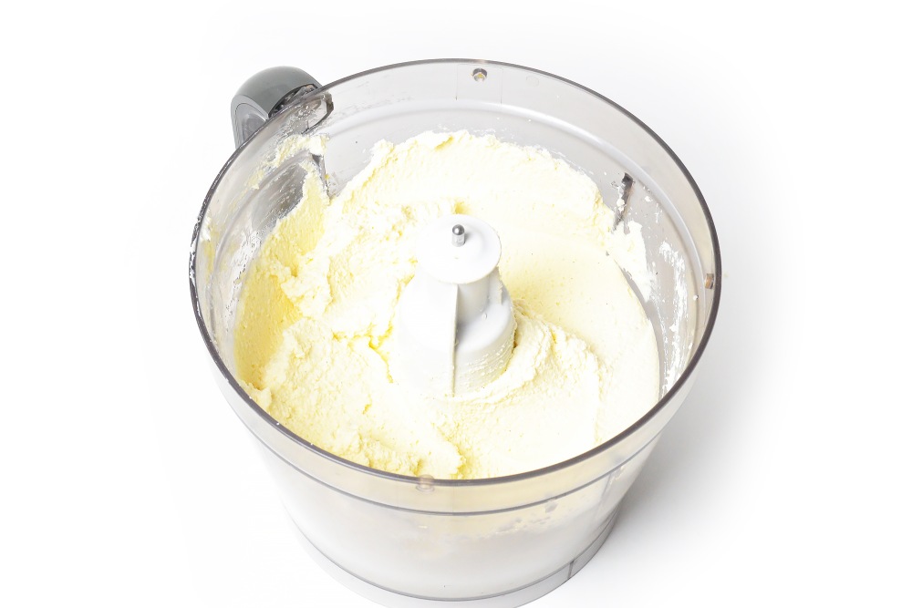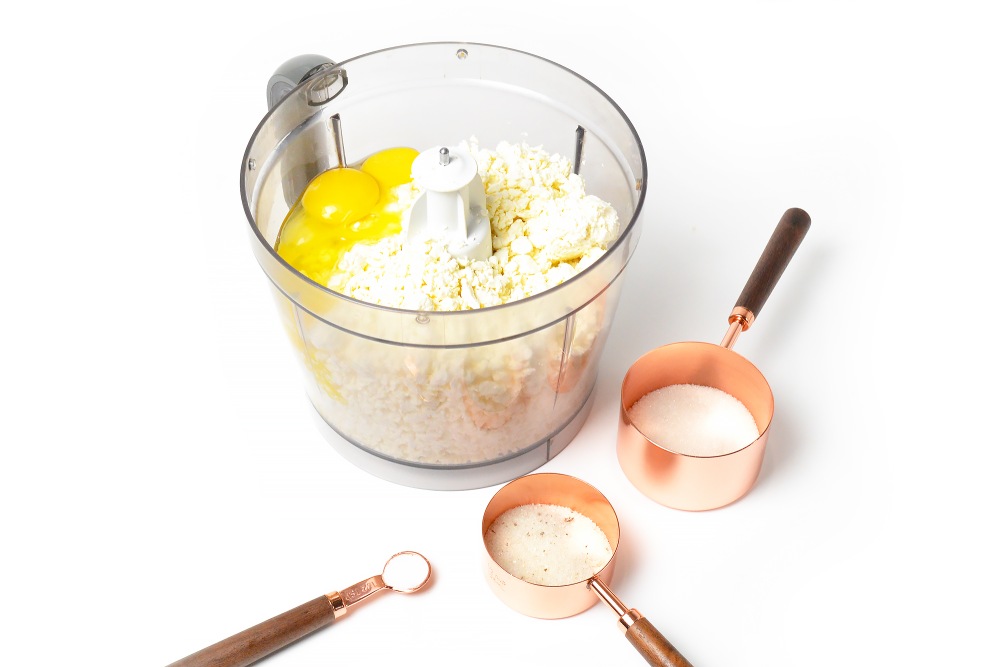 Совет: чтобы хорошо измельчить 1 кг творога за 1 заход, чаша должна быть объемом не менее 3 л. Если она меньше, то лучше измельчать ингредиенты в 2 захода, а потом смешивать в миске лопаткой.