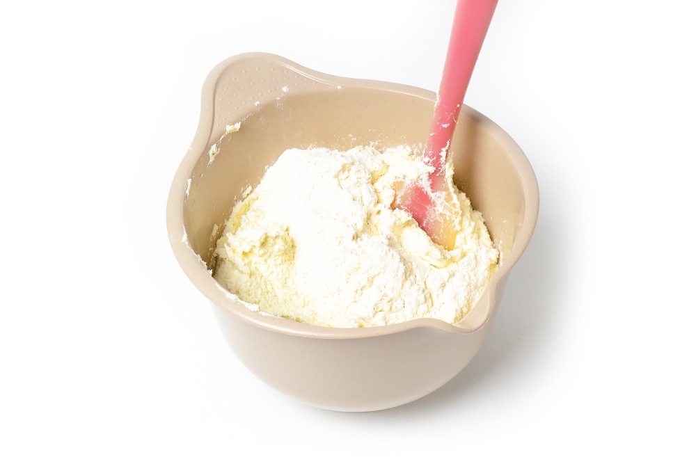 Переложить в удобную миску для замеса и добавить половину муки. Тщательно перемешать лопаткой. Если масса жидковата, сильно липнет, то добавить еще. Она должна получиться чуть более вязкой, чем на обычные сырники. Цель – получить массу, которая хорошо выдавливается из пакета, но не растекается.