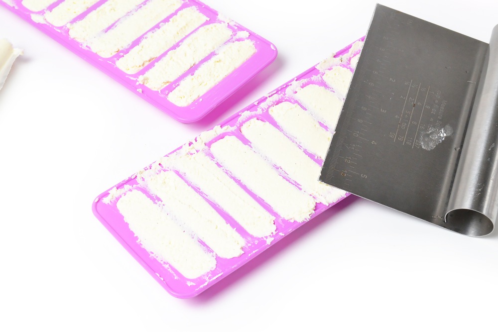 Срезать кончик пакета так, чтобы получился диаметр около 1,5 см (если ячейки формочек шире, отрезайте под их ширину). Отсадить по силиконовым формочкам, тщательно заполняя каждую ячейку. Слегка придавливайте творог носиком мешка во время отсадки, чтобы не было пустот.