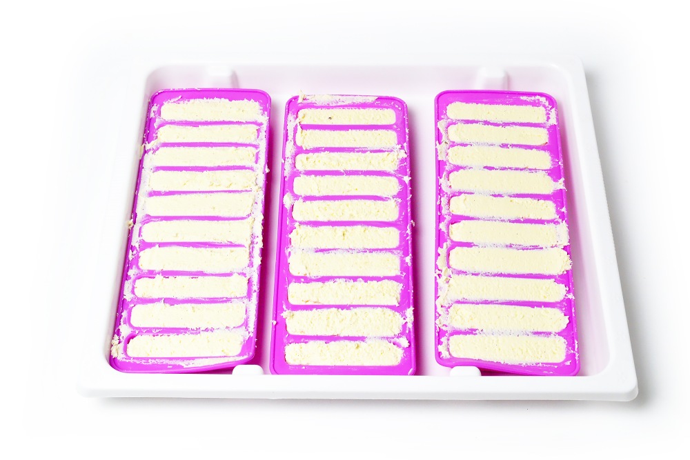 Замерзшие палочки освободить от формы. Отсадить оставшийся творог в пустые формочки и снова убрать в морозилку на 2-3 часа.