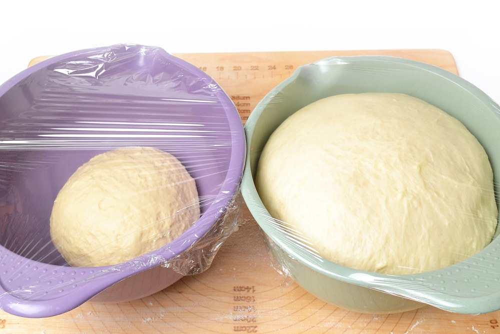 Слегка обмять и положить в миску каждую часть теста. Миску предварительно смазать растительным маслом. Накрыть и поставить в теплое место на 2-4 часа.
