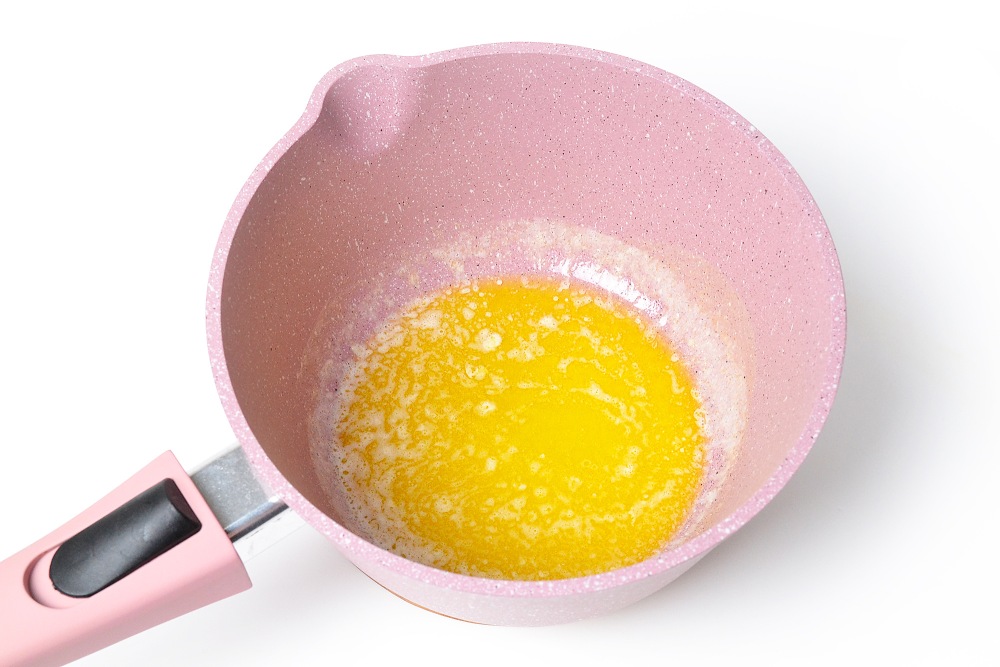 Первым делом растопить сливочное масло в сотейнике или небольшой кастрюле на небольшой мощности (2-3/6 для электроплиты). Нежелательно, чтобы оно кипело или горело. Затем маслу нужно дать остыть до 35-40 градусов.