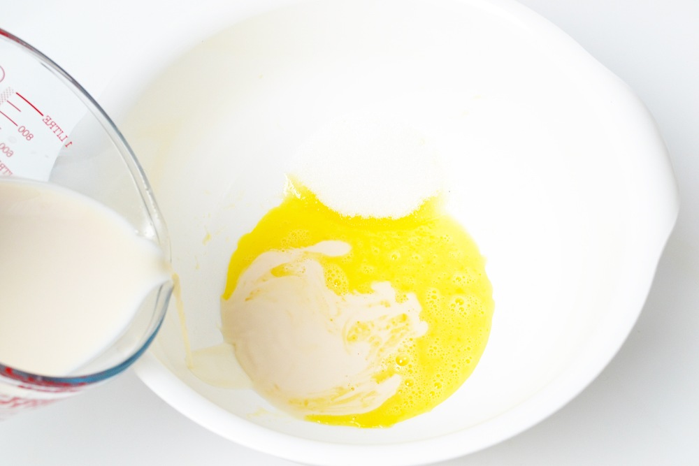 В глубокую миску добавить яйцо и немного взболтать его венчиком, чтобы разбить желток и белок. Всыпать оставшийся сахар и влить теплое молоко с дрожжами. Тщательно перемешать.