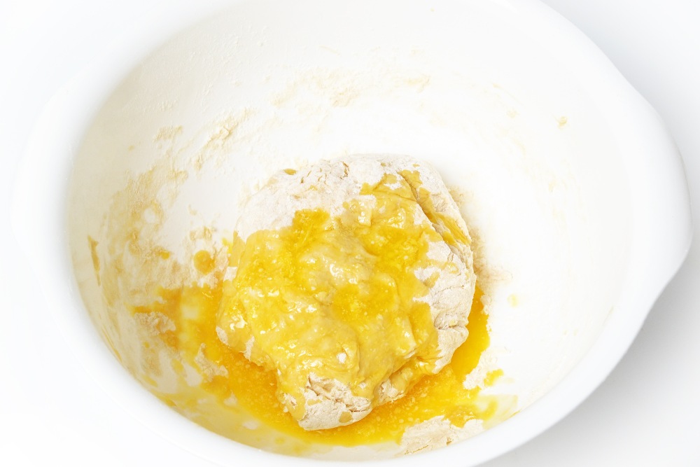 Перемешать, добавить еще часть муки. Замесить умеренно плотное тесто перед добавлением масла.