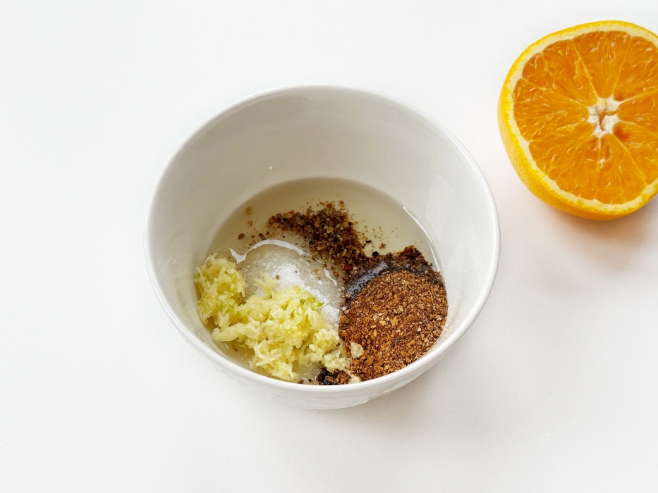 Для маринада смешать соль, перец, измельченный чеснок, растительное масло и травы. Я использую смесь приправ, в составе которой кориандр, базилик, можжевельник, тимьян и майоран. Добавить апельсиновый сок, выжав его прямо в миску.