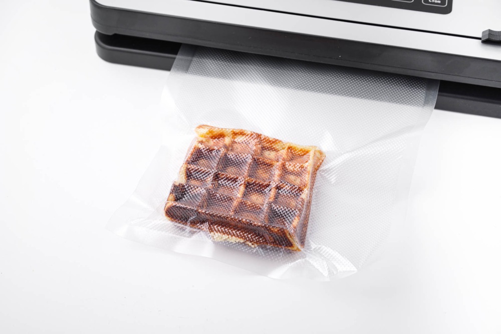 Готовые вафли разложить порционно по пакетам, чтобы было удобно доставать нужное количество. Удалить воздух с помощью вакууматора. Отправить в морозилку.