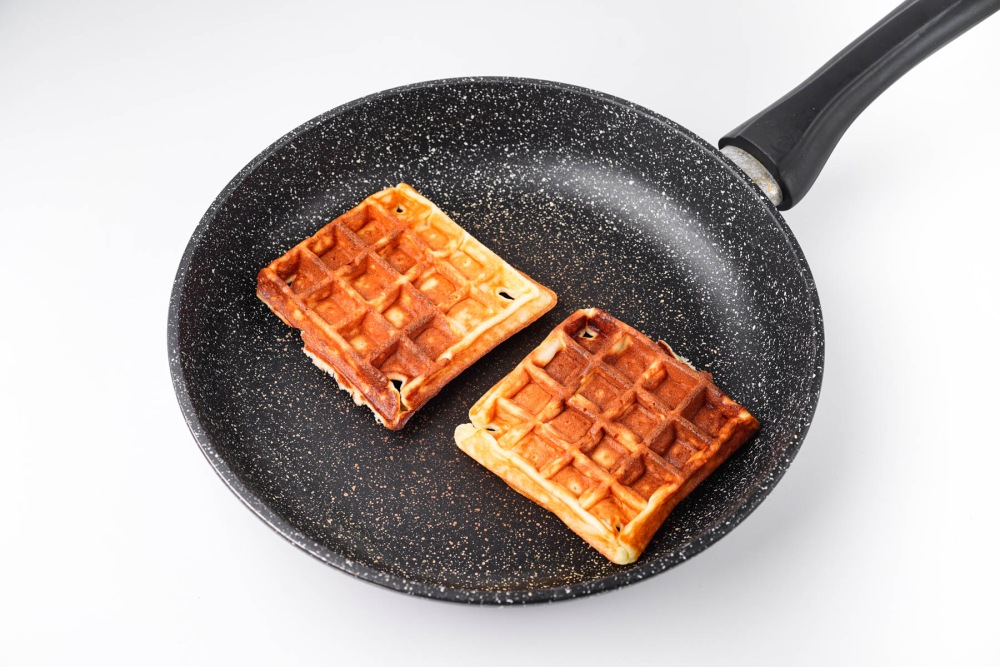 Достать нужное количество вафель из морозильника. Не размораживать их заранее, чтобы сохранить структуру. Выложить на сухую сковороду или в аэрогриль и прогреть до мягкости и лёгкой хрустящей корочки, около 5 минут.