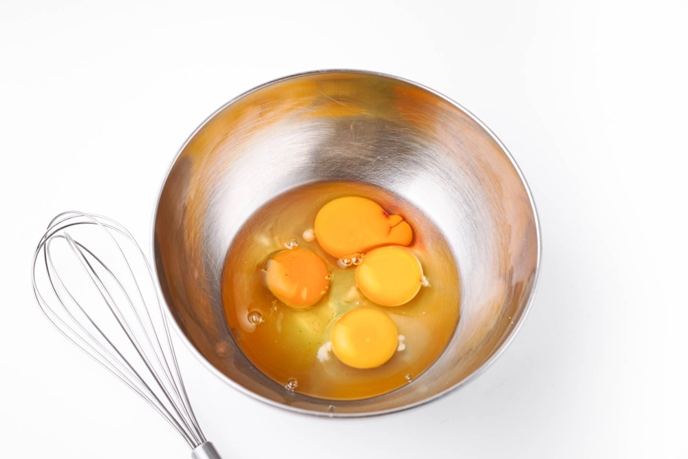 Разбить яйца в глубокую миску. Взбить их венчиком до однородной массы, чтобы белок и желток полностью соединились. Добиться лёгкой пены, но не взбивать слишком долго.