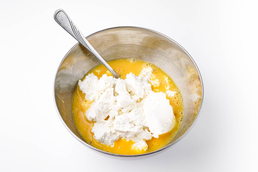 Выложить творог к яйцам. Тщательно перемешать массу, разминая комочки вилкой или венчиком. Сделать смесь максимально однородной, чтобы в тесте не было крупных кусочков.