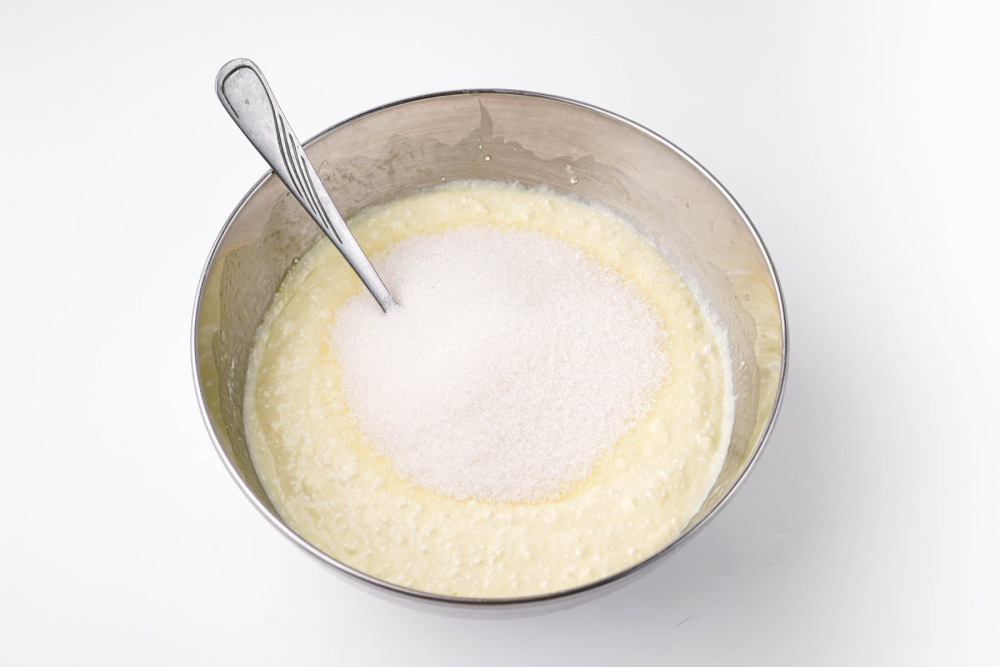 Всыпать сахар в творожную массу. Перемешать до растворения кристаллов, чтобы текстура стала гладкой. Попробовать массу и при необходимости отрегулировать сладость.