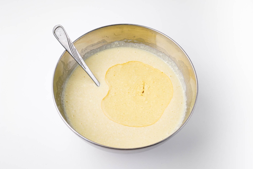 Влить растительное масло или растопленное сливочное. Тщательно перемешать, чтобы масло равномерно распределилось по всей массе. Следить, чтобы не оставалось жирных разводов.