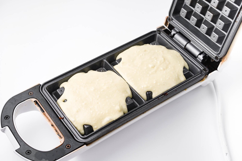 Разогреть вафельницу, выложить примерно по 2 столовые ложки теста в каждый отсек.