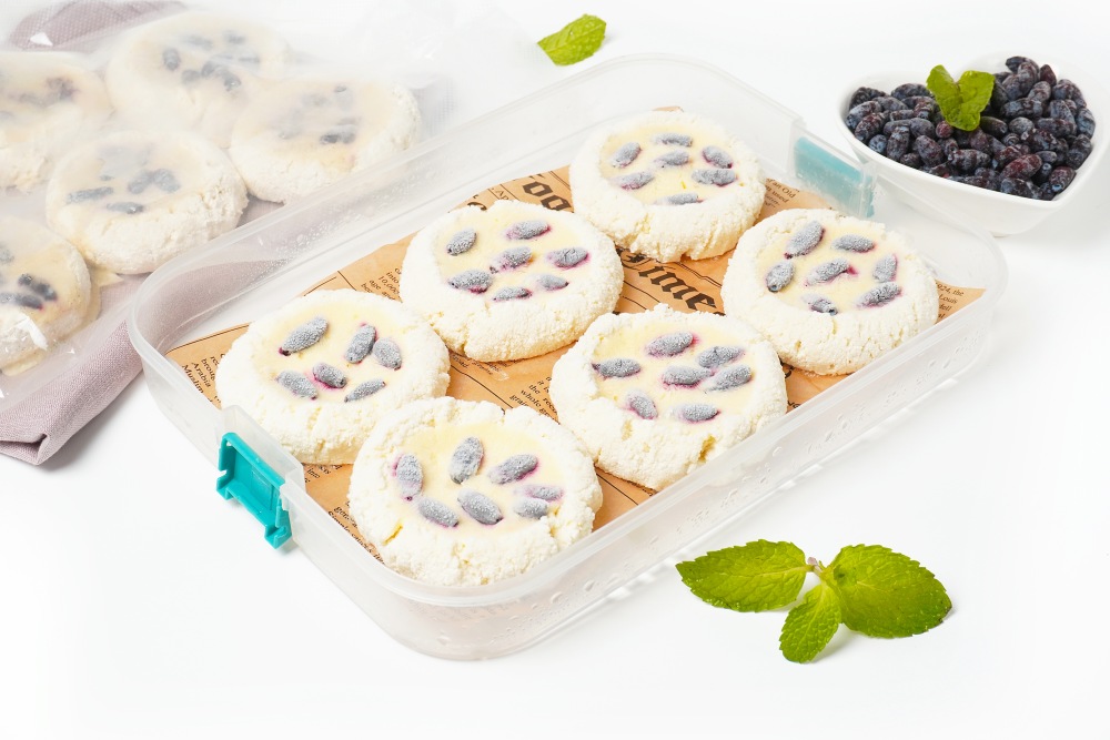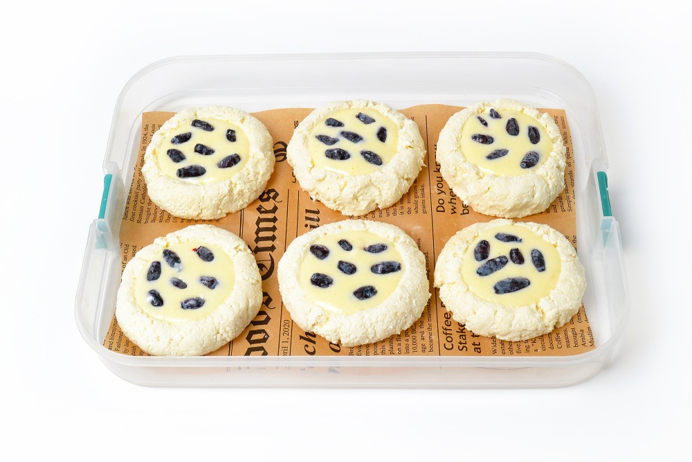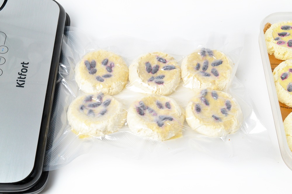 Еще один большой плюс – весь сахар можно заменить сиропом топинамбура или сахарозаменителями, а вместо белой муки использовать цельнозерновую, кокосовую или рисовую. По вкусу же ватрушки получаются чем-то вроде сырников с приятной ягодной кислинкой. И без лишнего масла для жарки! Ведь готовятся они в духовке. Кстати, при вакуумировании рекомендую складывать ватрушки порционно, чтобы открытый пакет не убирать снова в морозилку.