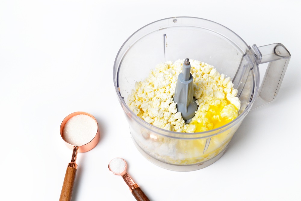 Смешать в блендере творог, яйцо, сахар и ванильный сахар, соль.
