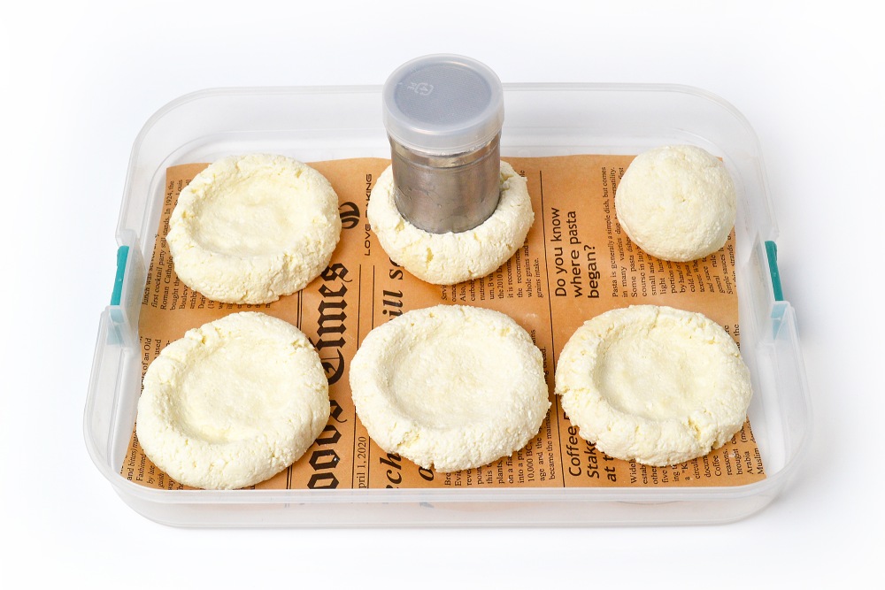 Подготовить лоток для заморозки, застелив его силиконизированным пергаментом. Выложить шарики творожного теста, разделив всю массу на 6 равных частей (примерно по 100 г на ватрушку).