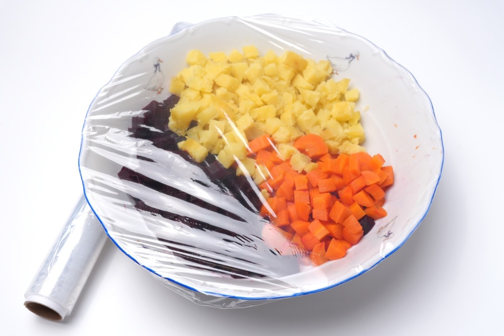 За 1-2 дня до мероприятия овощи можно нарезать и разложить по контейнерам или смешать в одной миске и обернуть пленкой. Очень желательно при таком хранении свеклу класть отдельно от картофеля и моркови, так как она окрасит овощи и сделает их водянистыми.