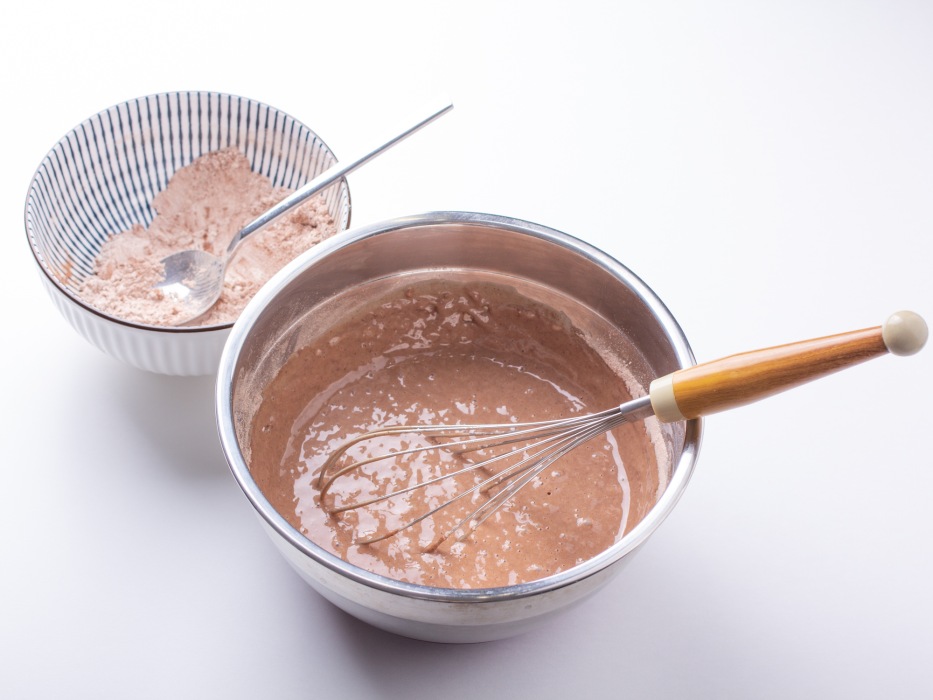 Добавить смесь муки с какао к жидкому тесту.
