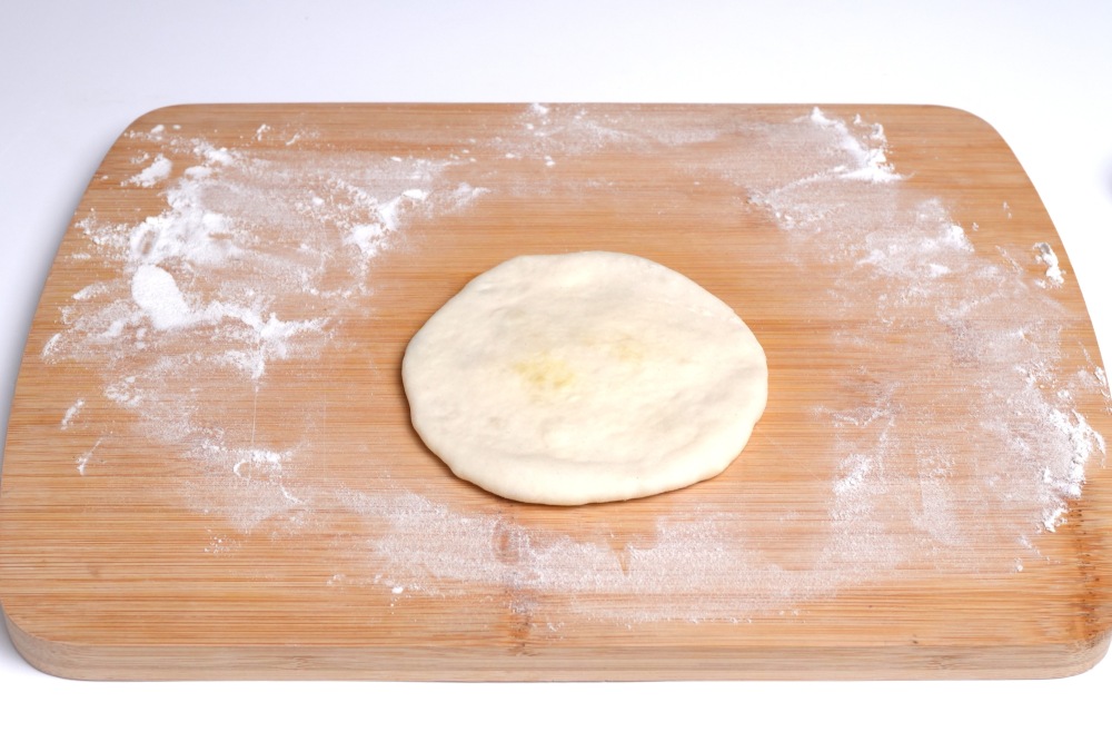 Крепко защипить края, аккуратно приплюснуть мешочек руками, чтобы получилась лепешка с начинкой. Убрать в сторону на пару минут, а после немного раскатать скалкой, чтобы лепешки получились тонкими.