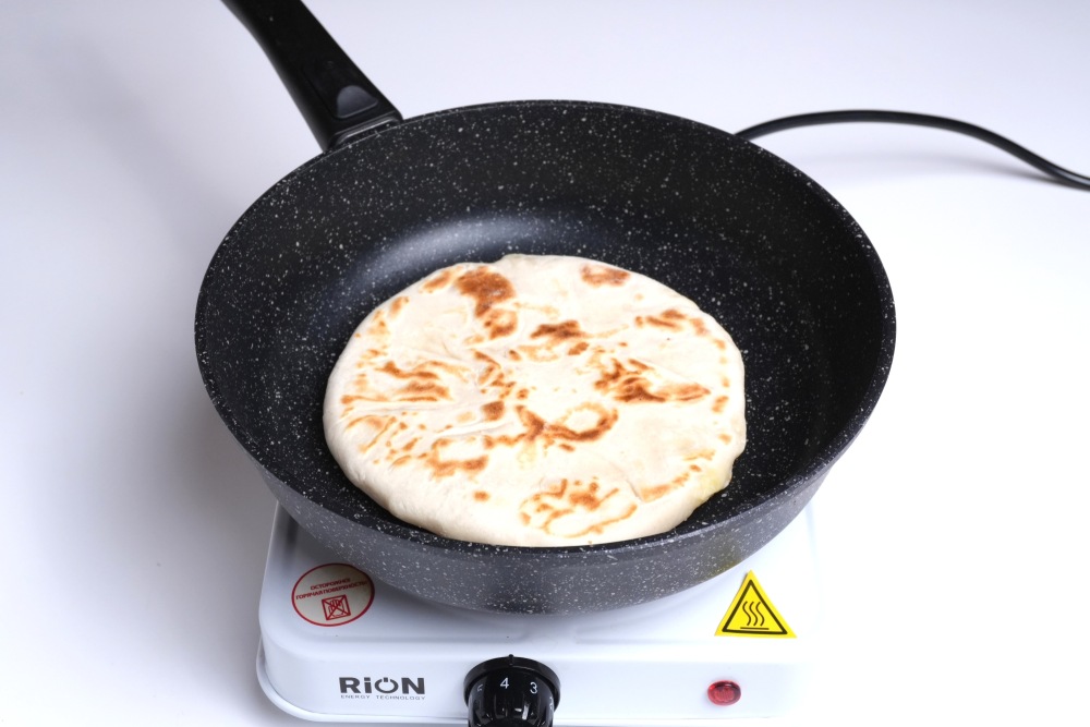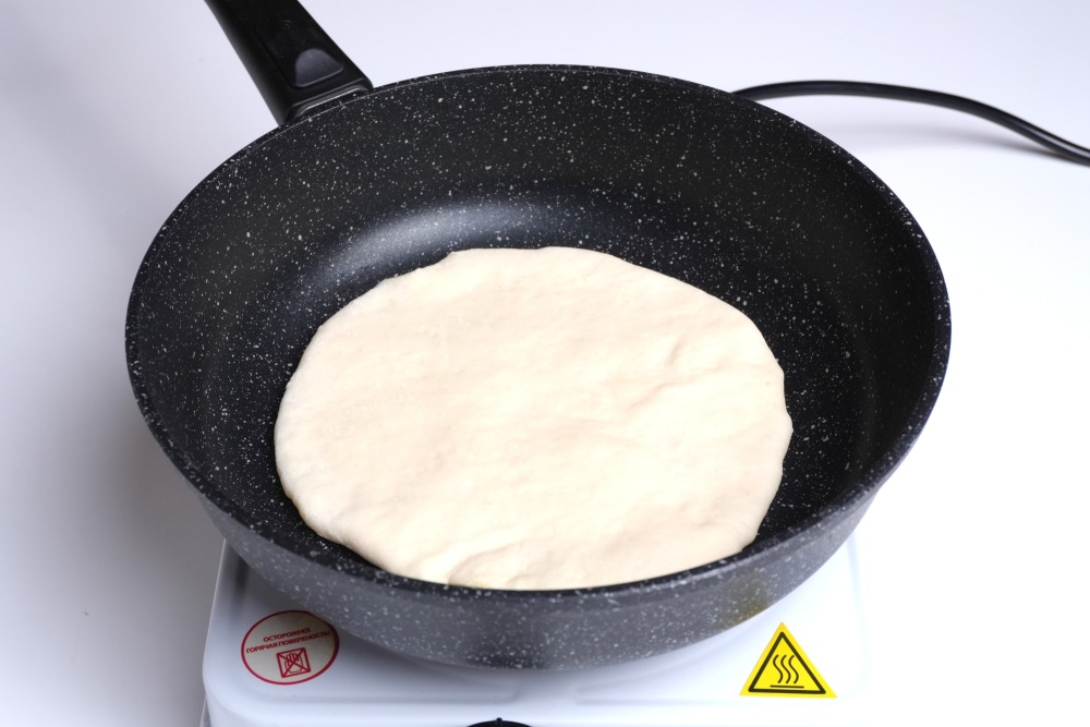 Выложить лепешку на разогретую сухую сковороду. Жарить на среднем огне.