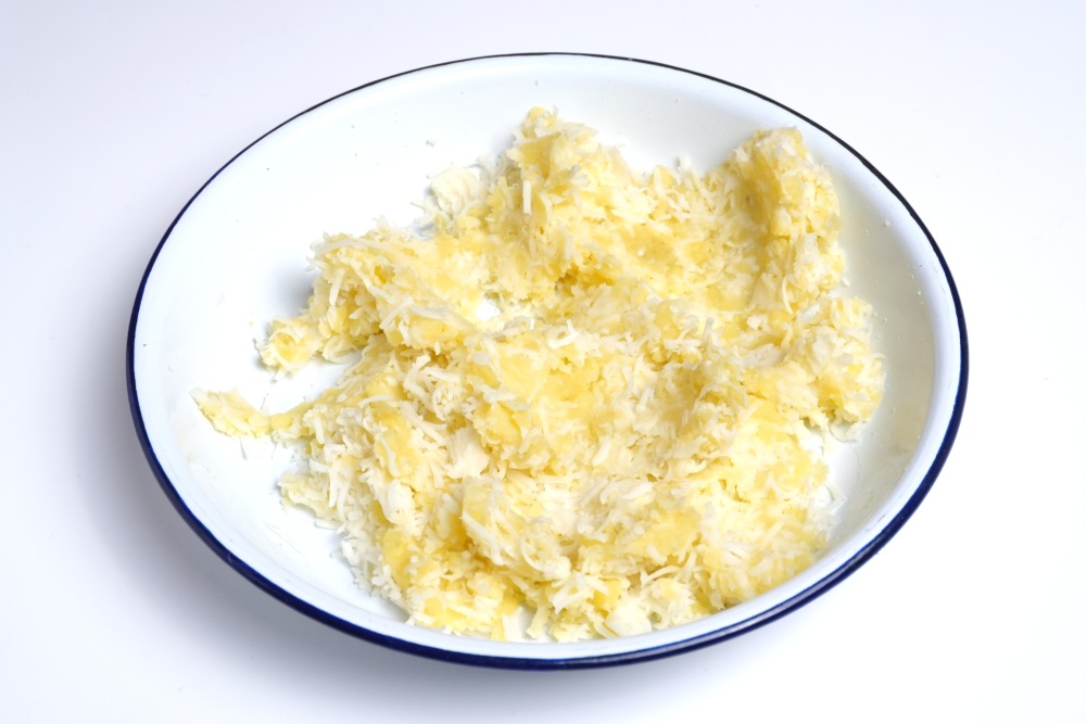 Смешать сыр и картофель. При необходимости, посолить и добавить перец.
