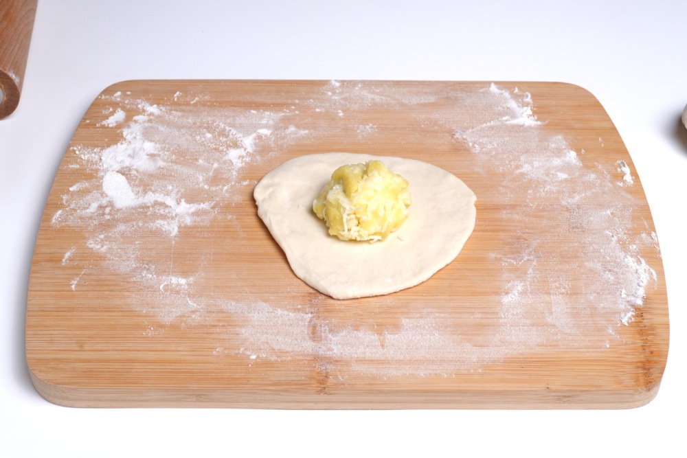 Крепко защипить края, формируя “мешочек” из теста. Аккуратно приплюснуть мешочек руками, чтобы получилась лепешка с начинкой внутри. Убрать лепешку в сторону на пару минут, чтобы тесто “привыкло” к начинке и заняться следующими лепешками, а после немного раскатать скалкой, чтобы лепешки получились тонкими. Следите, чтобы тесто не порвалось.