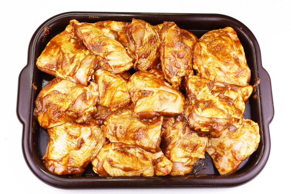 Приготовленный маринад равномерно распределить на каждое куриное бедро.