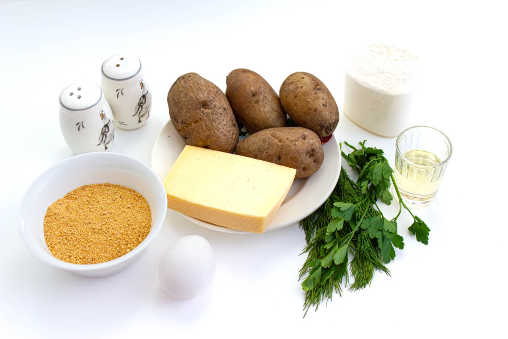 Подготовить ингредиенты для картофельных палочек с сыром для заготовки впрок. Картофель крахмалистых сортов, полутвёрдый сыр (у меня Российский), яйцо, муку, панировочные сухари, соль, специи и растительное масло.