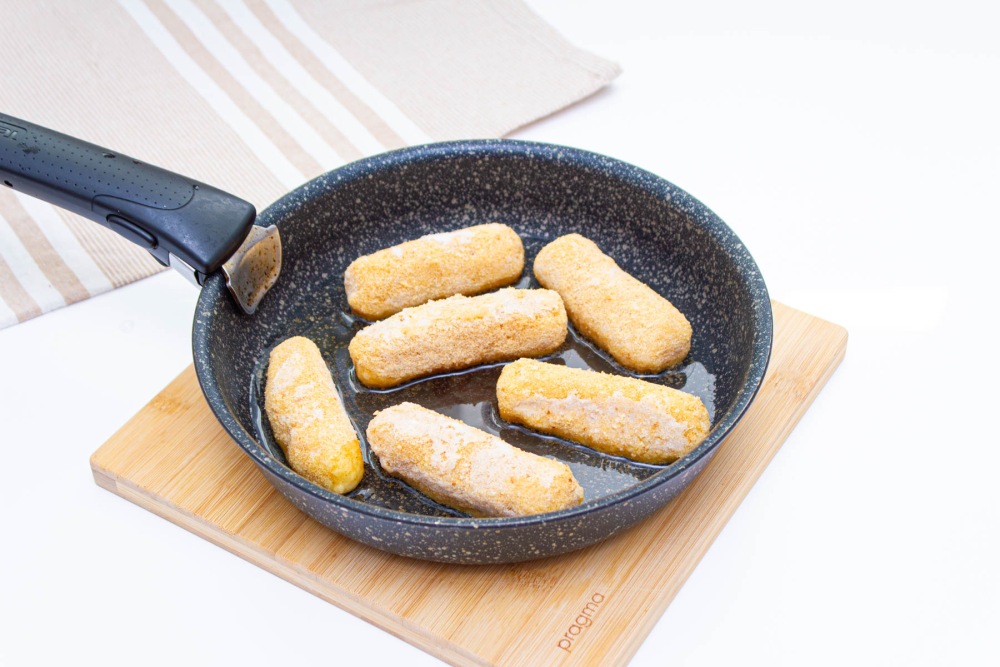 Влить растительное масло в сковороду и разогреть на среднем огне/мощности. Обжарить палочки на среднем огне с двух сторон по 5-7 минут до появления золотой корочки.