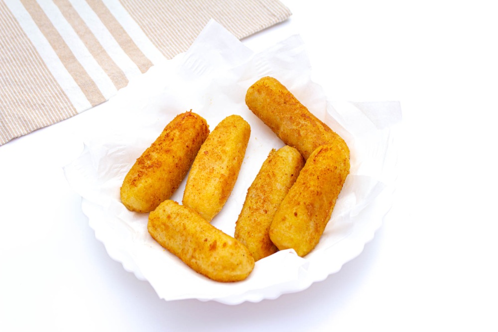 Вкус у палочек очень домашний и уютный: нежное картофельное пюре с лёгкой сливочной ноткой, а внутри — насыщенный, чуть солоноватый сыр, который при запекании становится тягучим и аппетитным. Снаружи — золотистая корочка, приятно хрустящая на зубах. Всё вместе создаёт гармоничное сочетание мягкости и хруста, сытности и лёгкости.