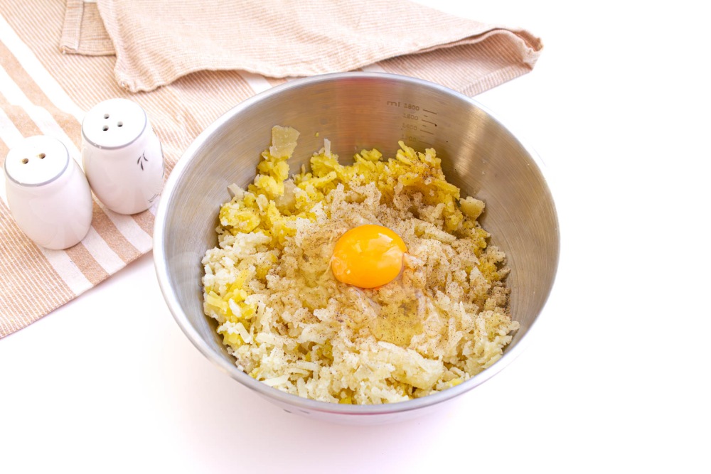 Смешать картофельное пюре с сырым куриным яйцом, добавить соль и специи по вкусу.