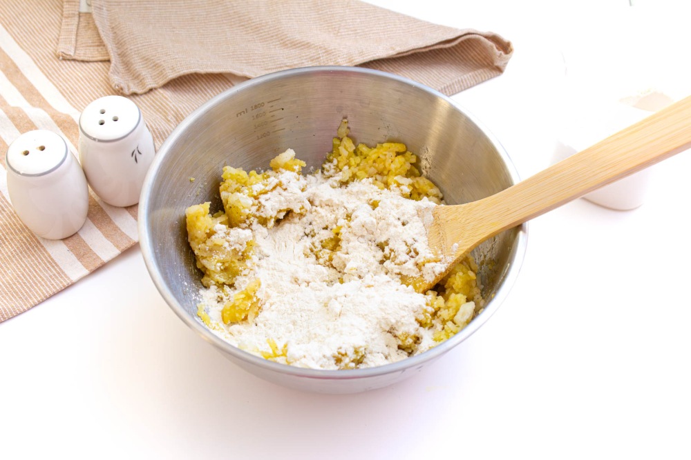 Добавить муку в пюре и хорошо все перемешать.