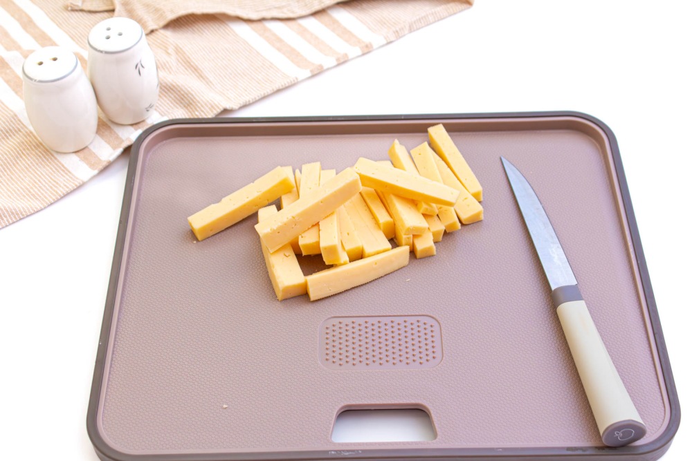 Сыр нарезать брусочками.