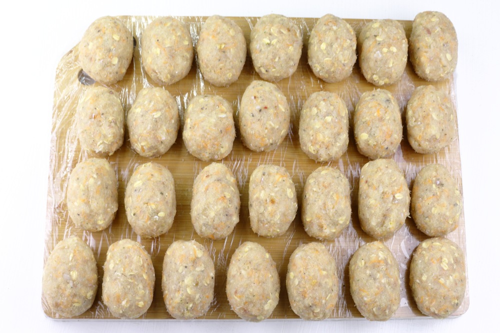 Из котлетной массы сформировать заготовки желаемой формы и размера. Я приготовила 33 котлетки весом каждая 75 г. При необходимости при формовке смочить руки водой, если фарш липнет к рукам. Доску или поднос застелить пищевой пленкой. Выложить полуфабрикат на небольшом расстоянии друг от друга. Отправить в морозильную камеру до полной заморозки (примерно 4-5 часов).