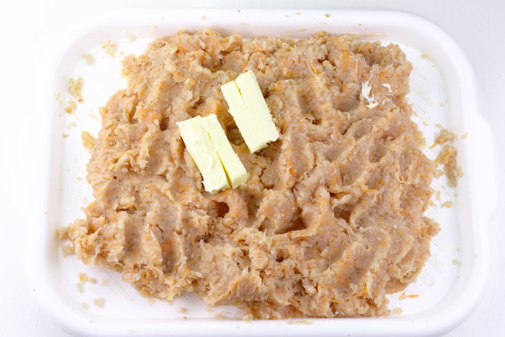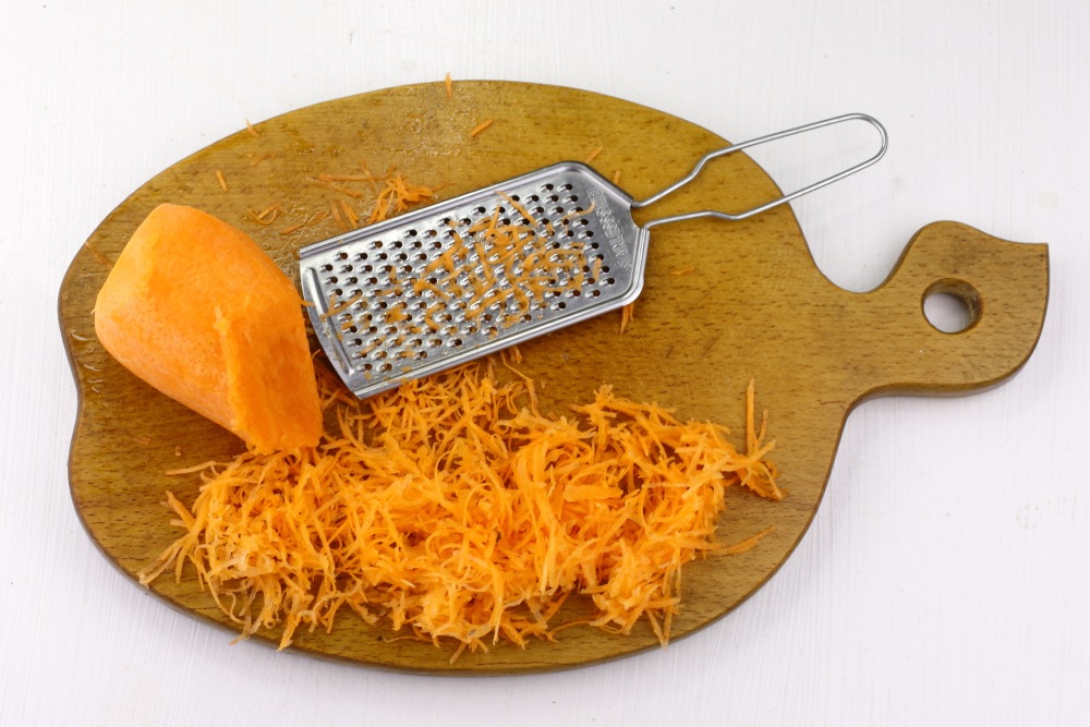 Очищенную и промытую морковь обсушить, чтобы убрать лишнюю влагу. Измельчить на мелкой терке.