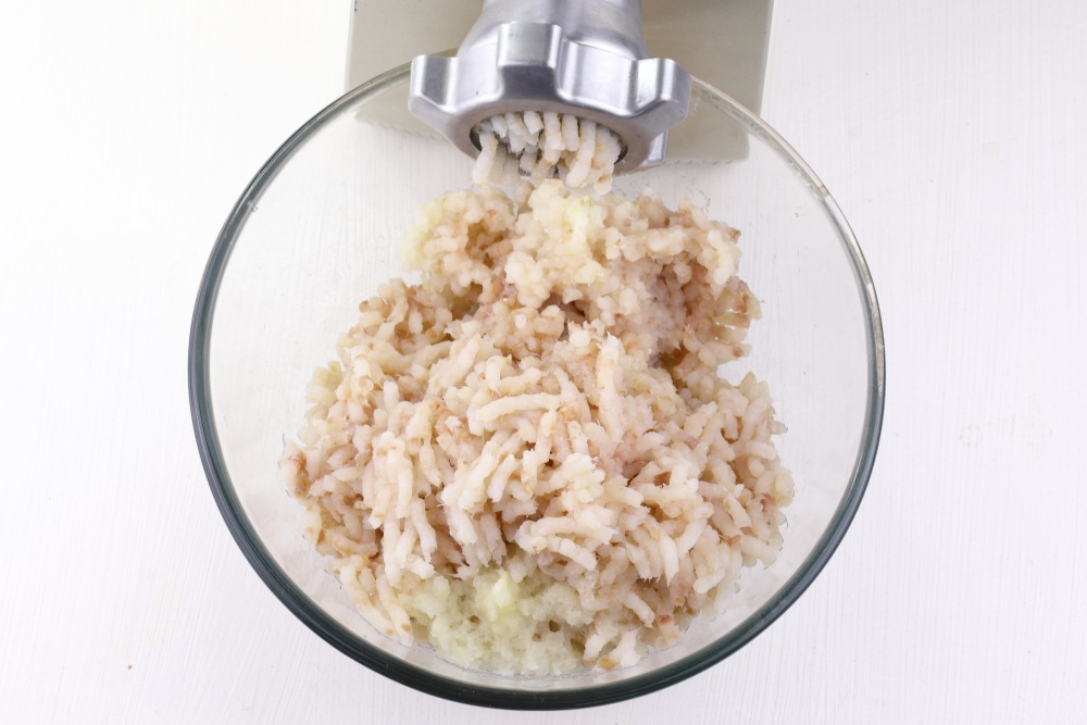 Подготовленное рыбное филе и лук пропустить через мясорубку. Эту процедуру можно повторить дважды, чтобы наверняка измельчить случайно попавшие косточки.